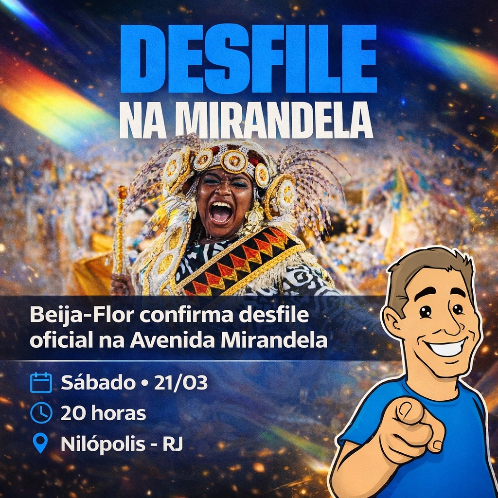 A Beija-Flor de Nilópolis confirmou a realização do seu tradicional desfile oficial na Avenida Mirandela, em Nilópolis. O evento está marcado para sábado, 21 de março, às 20h, e promete reunir a comunidade em uma grande celebração do samba.